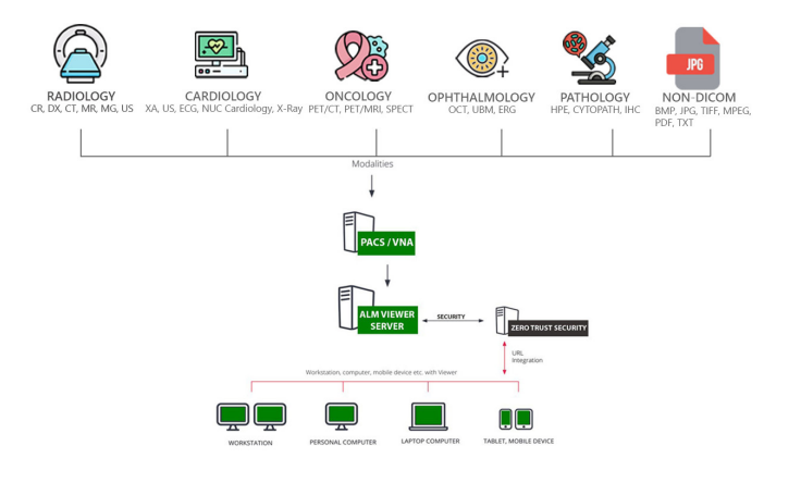 The ALM DICOM Viewer can be integrated into any PACS system/VNA including: ALM Viewer PACS, dcm4chee, Orthanc, etc.
